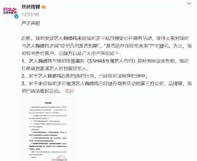 到2024年11月,丝芭起诉《新视线》《精品购物指南》等与鞠婧祎合作的第三方,主张自身享有独家经纪权,要求下架相关物料并索赔30万元。