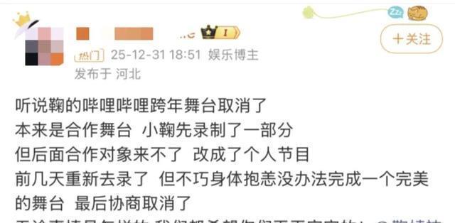 虽然粉丝那边也有统一说法应对,关于B站跨年舞台取消,粉丝澄清并非刻意缺席,而是原本敲定的是合作舞台,鞠婧祎早早完成了部分内容的录制,结果后续合作对象因故无法到场,节目组只能临时调整方案,把合作舞台改成了她的个人节目。 原本团队还安排了重新进棚录制的行程,谁料鞠婧祎偏偏赶上身体抱恙,实在没法呈现出一个完美的舞台效果,最后才和平台协商一致,取消了这次演出。