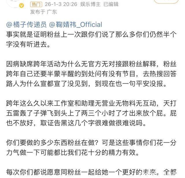 突然这么彻底地消失,还是在合约纠纷、新剧待播的关键节点,本来就容易引发争议啊。 何况还正好赶上跨年、元旦这种明星必争的曝光节点,很多平时不爱营业的艺人都会出来送祝福、刷存在感,她却啥动态都没发,这合理吗? 缺席舞台都没给粉丝个解释,她本人杳无音信,工作室也一声不吭,对接也毫无动静,“身体抱恙”这一说法还是12月29日有狗仔发了个她捂着肚子赶工的视频,大家连猜带蒙拼凑出来的。