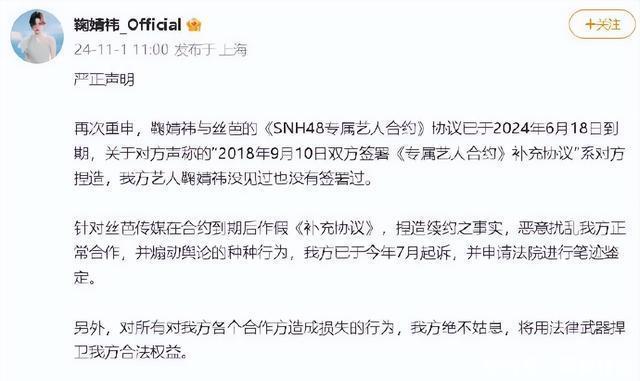 再到2025年12月,鞠婧祎方通过律师声明,拿出法院两次委托的鉴定结果,均显示“无法判断补充协议签名为本人所写”,指控丝芭伪造文件、骚扰合作方。