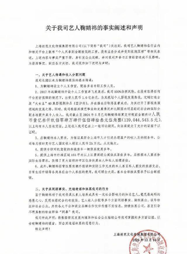 丝芭迅速反击,晒出自行委托的鉴定报告,称“签名真实有效”,还披露给鞠婧祎的税前收入达1.39亿元、每月固定工资25万元等福利,反驳“压榨”说法。