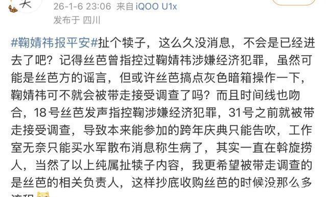 但说一千道一万,把矛头对准鞠婧祎的最多,她和丝芭的纠纷正处在风口浪尖,不少网友觉得,丝芭都实名举报了,平台怕踩雷、想避险也合理,之前又不是没有过类似纠纷导致剧集延播好几年的先例。 甚至由此衍生出一些更无厘头的猜测,什么“软封杀”啊,什么“风险艺人”啊,什么“已经被带走调查了”啊,怎么脑洞大开怎么来。
