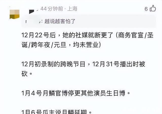 谁知道,大家悬着的心才刚刚松了口气,以为风波可控,不会影响作品上线和后续资源,就来了个两极反转。 12月22日之后,鞠婧祎没在社交平台上更新过任何日常动态,截至现在已经停更16天;原定的B站跨年舞台也被临时取消;月鳞绮纪也停更了其他演员的生日博,种种迹象似乎都不太对劲。