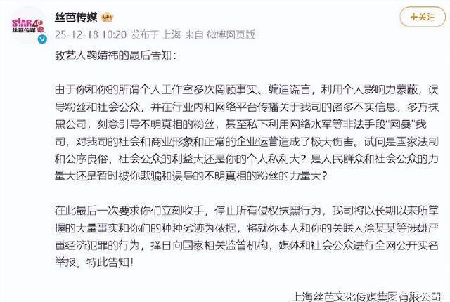 双方彻底断绝协商可能,是2025年12月18日,丝芭再度加码,发布《致艺人鞠婧祎的最后告知》,宣布将实名举报她及关联人涂某某涉嫌“严重经济犯罪”。 一纸报警回执,直接将纠纷从合约问题推向了更严重的刑事法律层面。