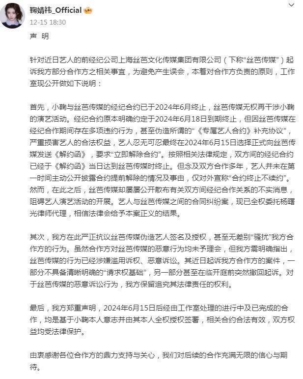 回想鞠婧祎和丝芭的解约传闻刚在网上沸沸扬扬传开时,就有不少人替她捏了把汗,丝芭前成员黄婷婷、冯薪朵等解约时,要么被判赔数百万,要么被限高,没一个能轻松脱身,大家都清楚,从这家公司全身而退,大概率要经历一番拉扯。 但没想到,这场纠纷会闹到如此极致,双方各执一词、互掷证据,矛盾不断升级。 从2024年6月,鞠婧祎方以合约原定6月18日到期且丝芭存在多项违约为由,于6月15日发送《解约函》宣布解除合约。
